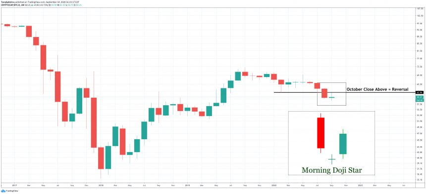 A close in September above that level could form a tweezer bottom, while a doji close here followed by a close above 62% would trigger morning star doji – a bullish reversal pattern and counterpart to the evening star formation mentioned previously related to BTCUSD.