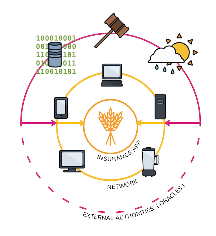 For example, a crop insurance application that’s dependent on an outside weather feed. (Say a farmer buys a derivative that automatically pays out if there’s a drought that impacts his work.)